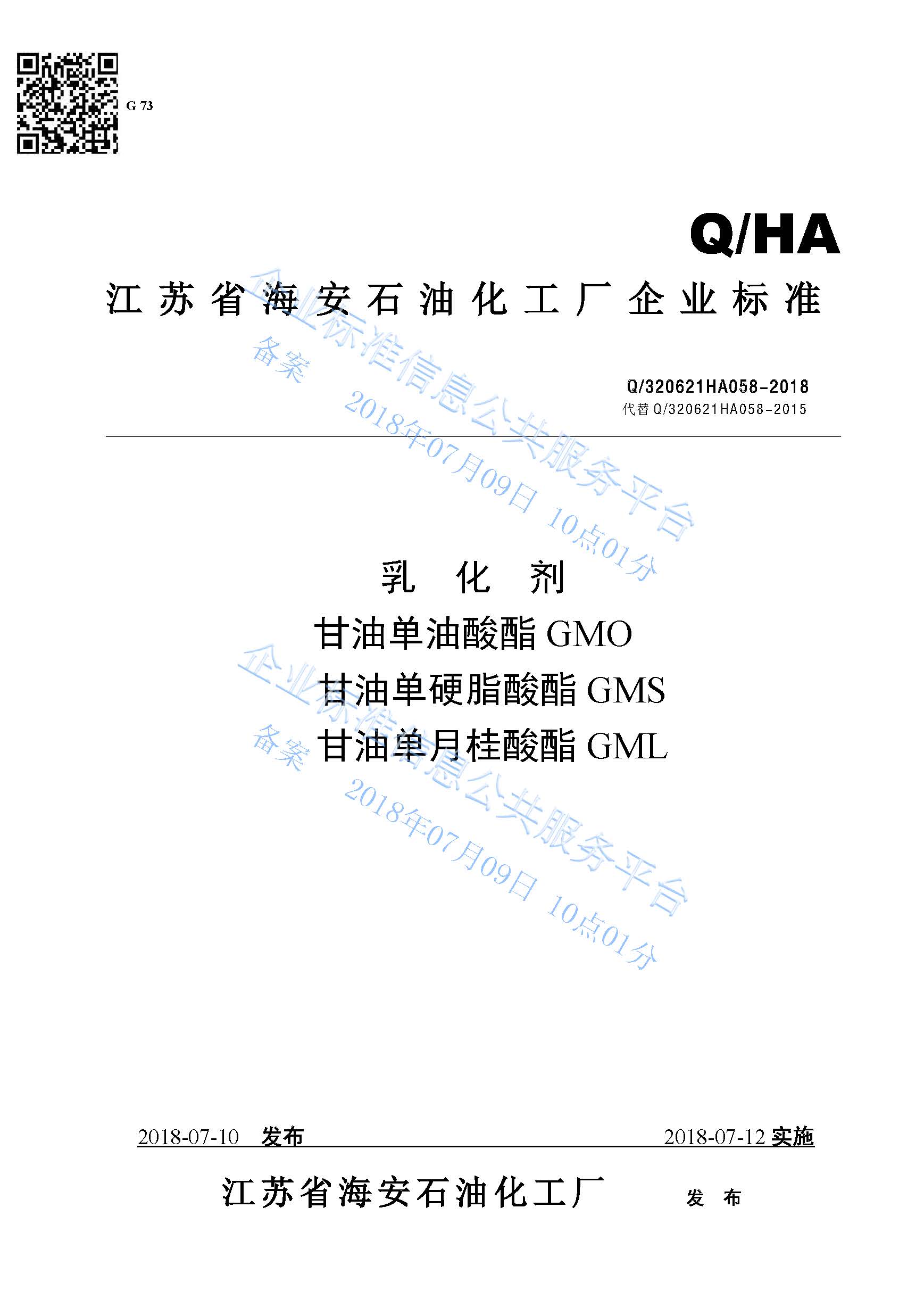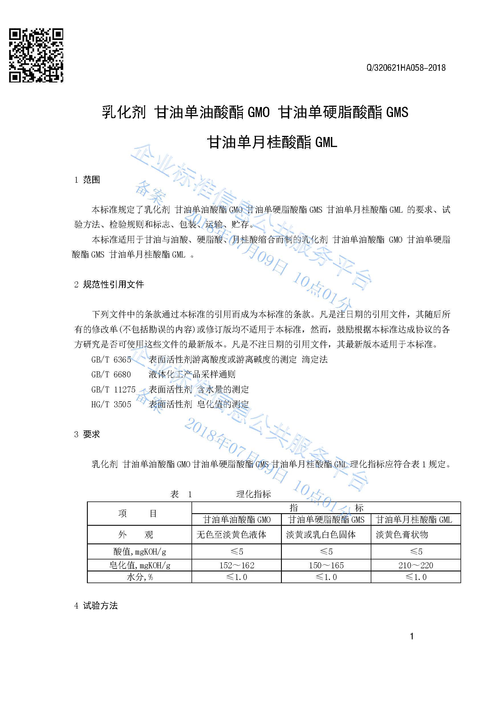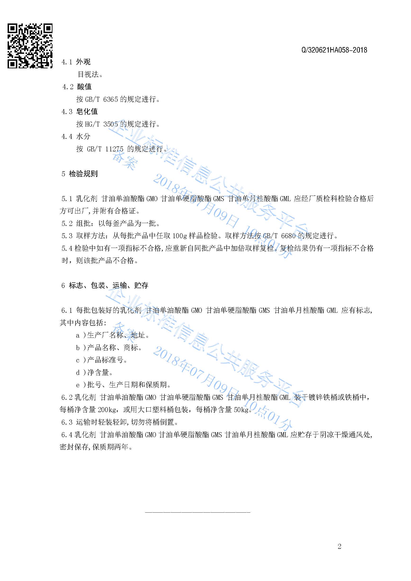 Q/320621HA058-2018 乳化剂甘油单油酸酯GMO 甘油单硬脂酸酯GMS 甘油单月桂酸酯GM产品标准