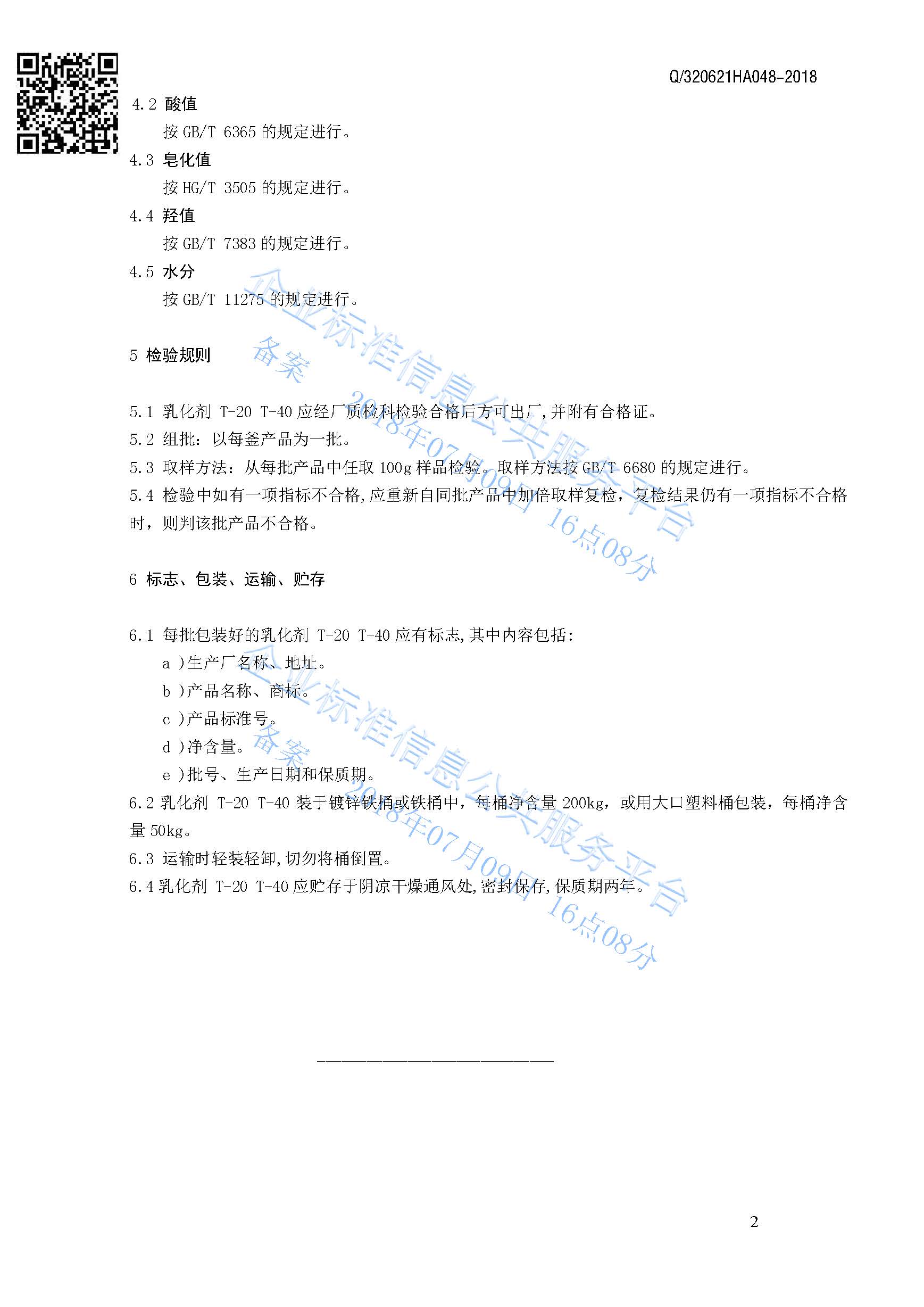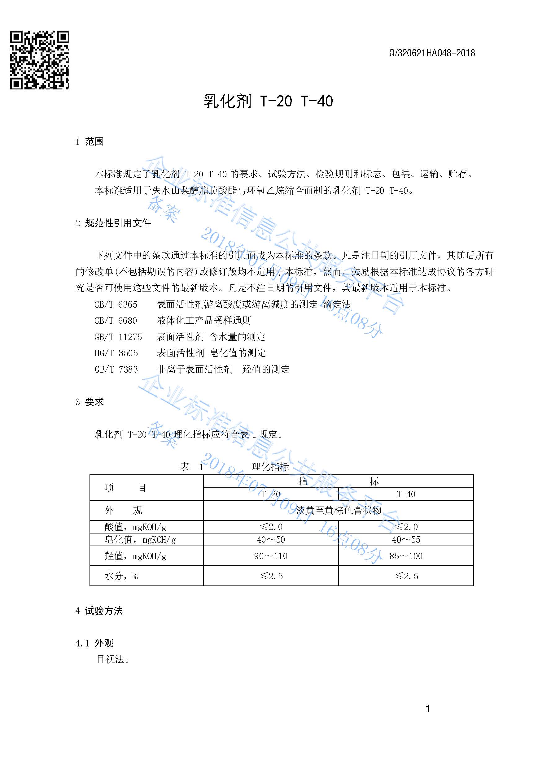 Q/320621HA048-2018 乳化剂T-20 T-40产品标准