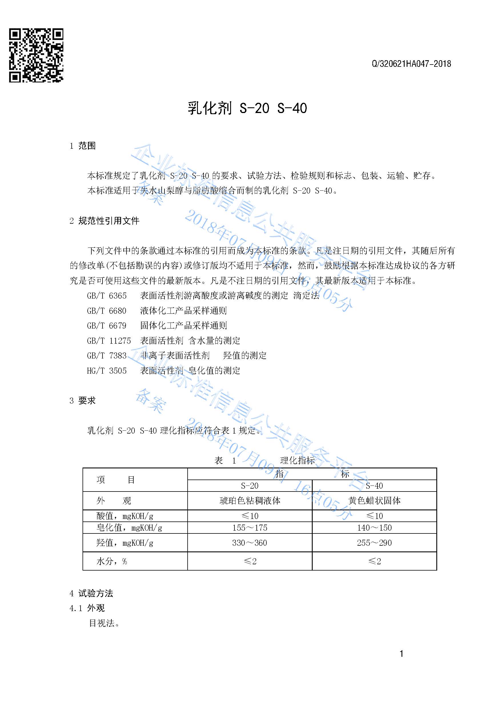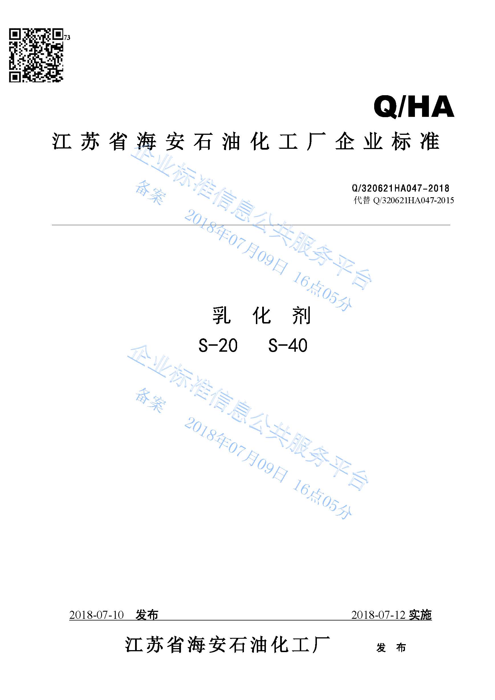 Q/320621HA047-2018 乳化剂S-20 S-40产品标准