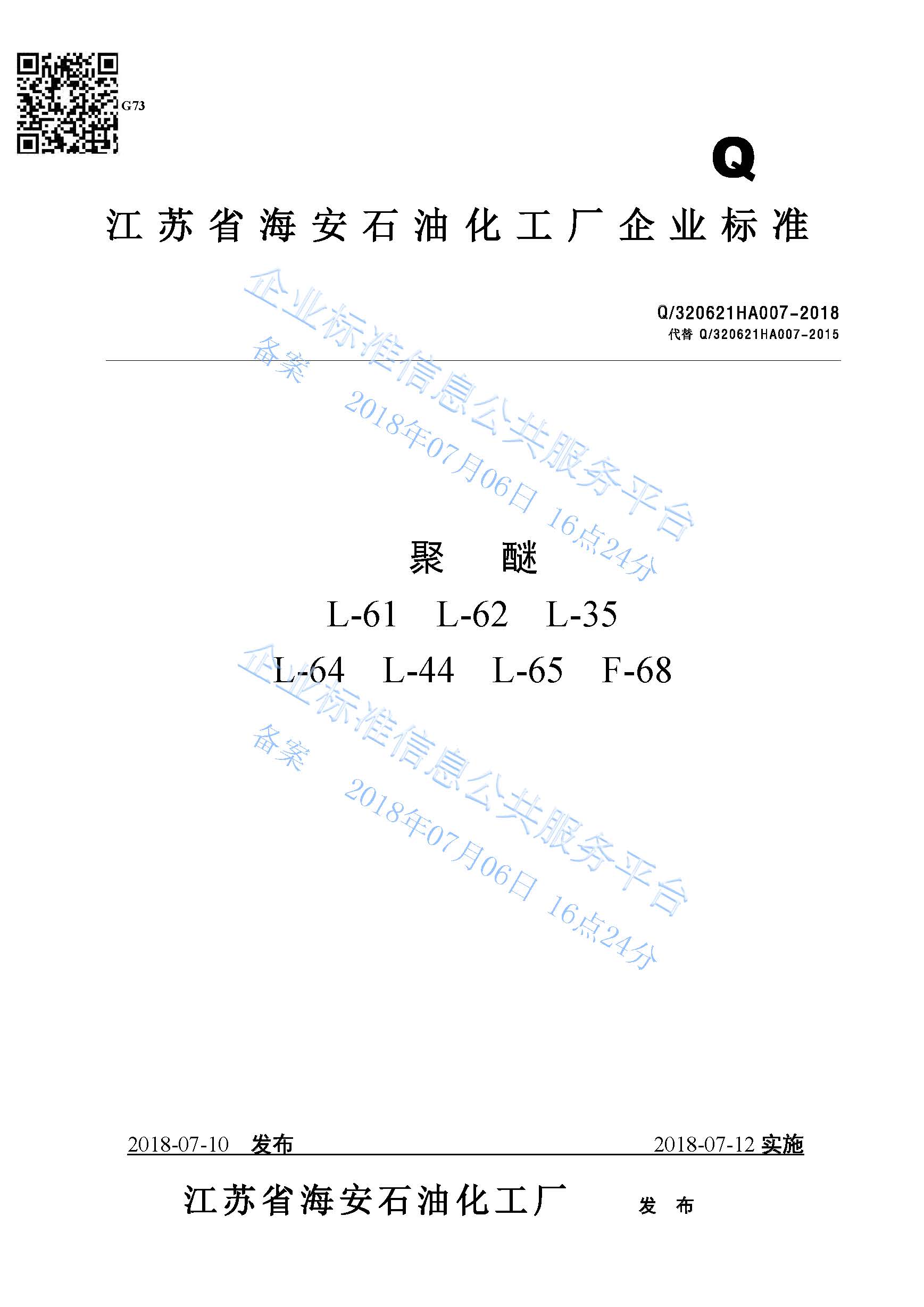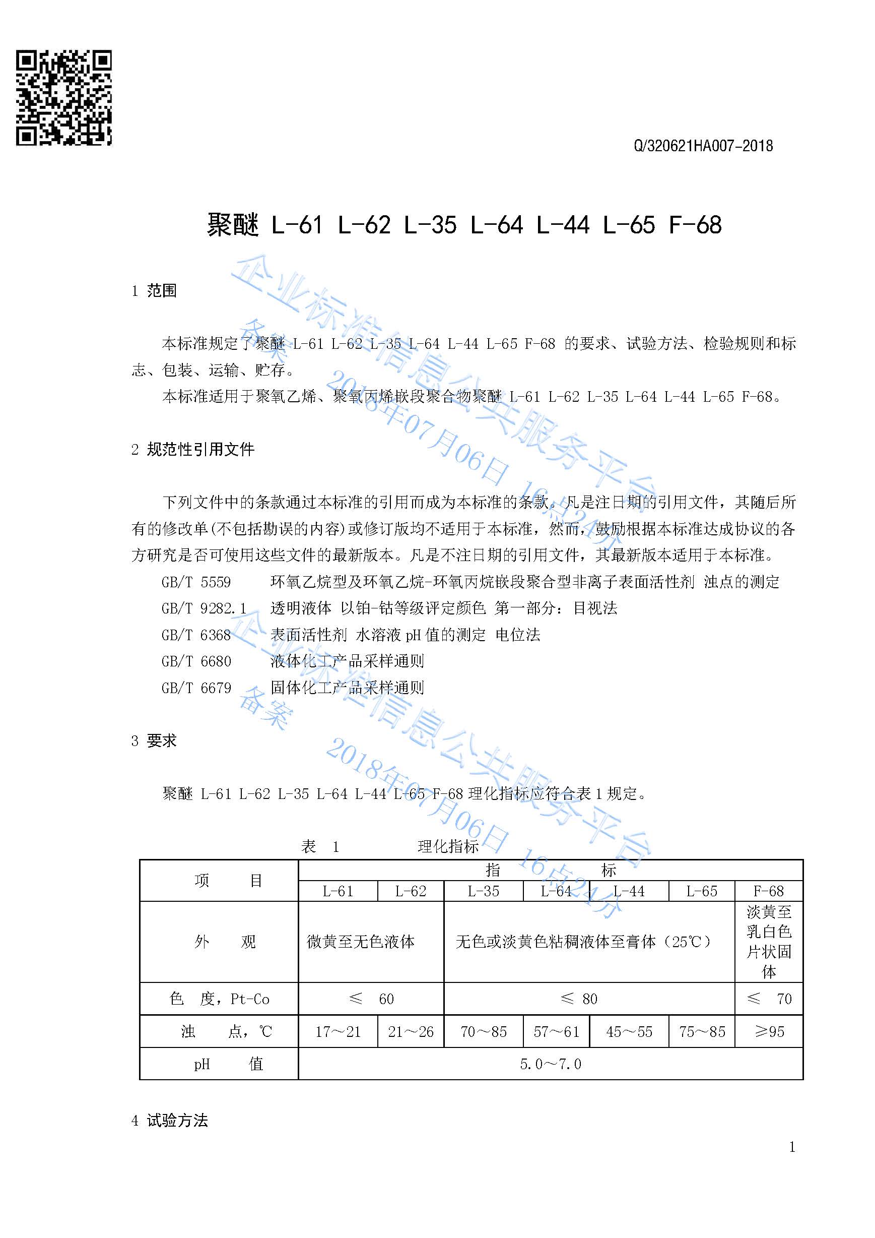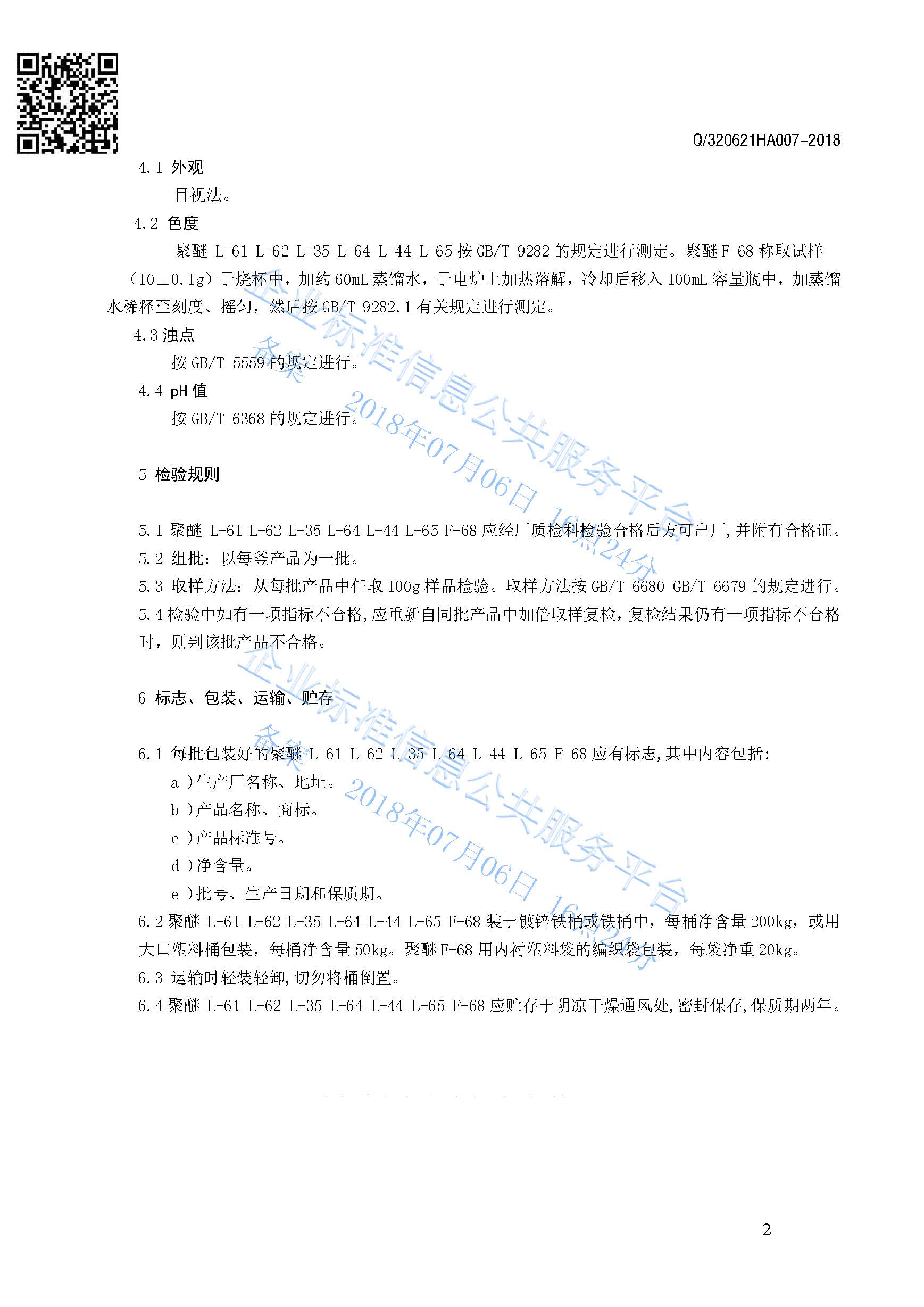 Q/320621HA007-2018 聚醚L-61 L-62 L-35 L-64 L-44 L-65 F-68产品标准