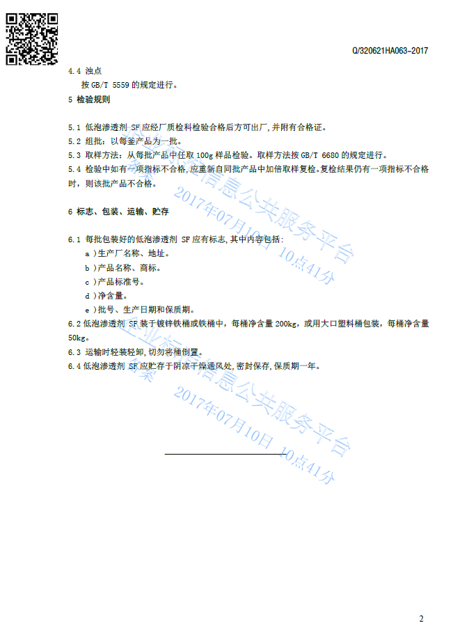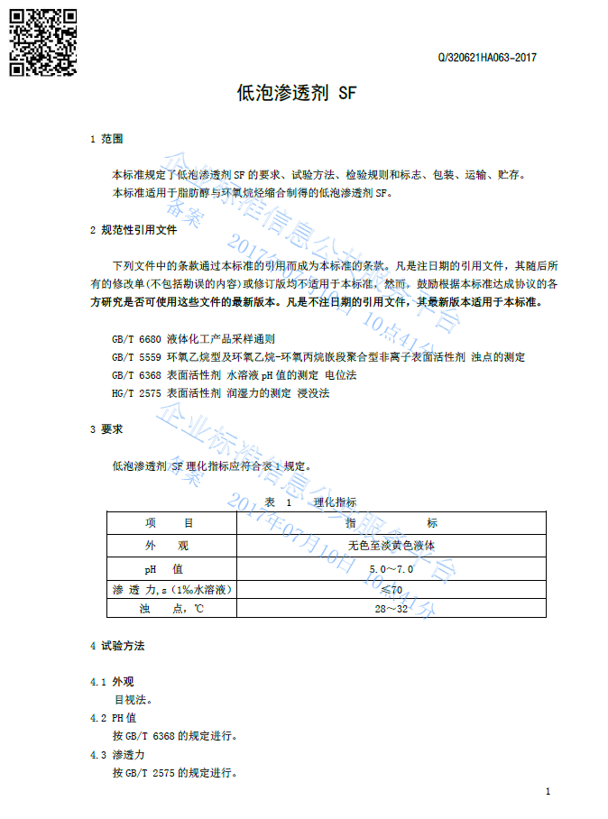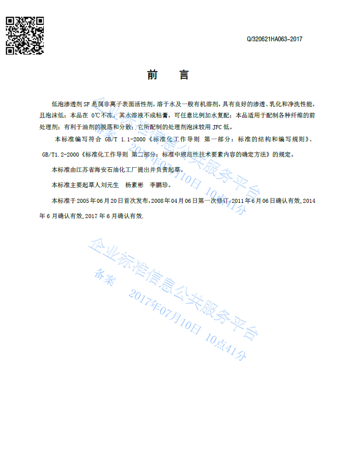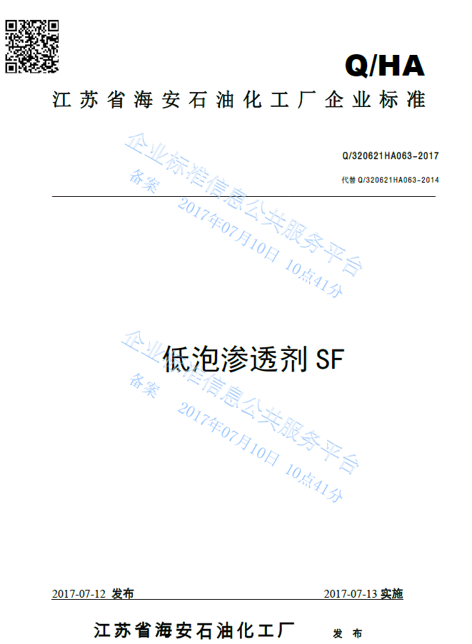 Q/320621HA063-2017 低泡渗透剂SF产品标准