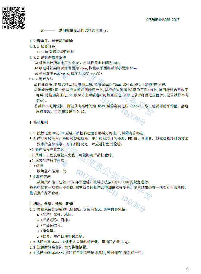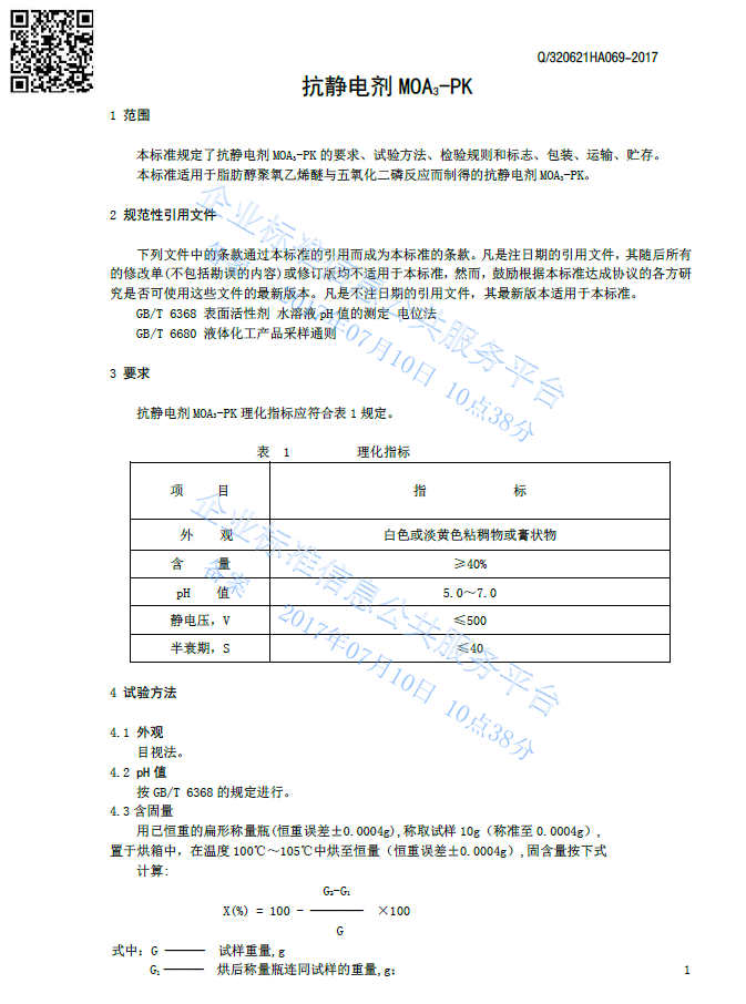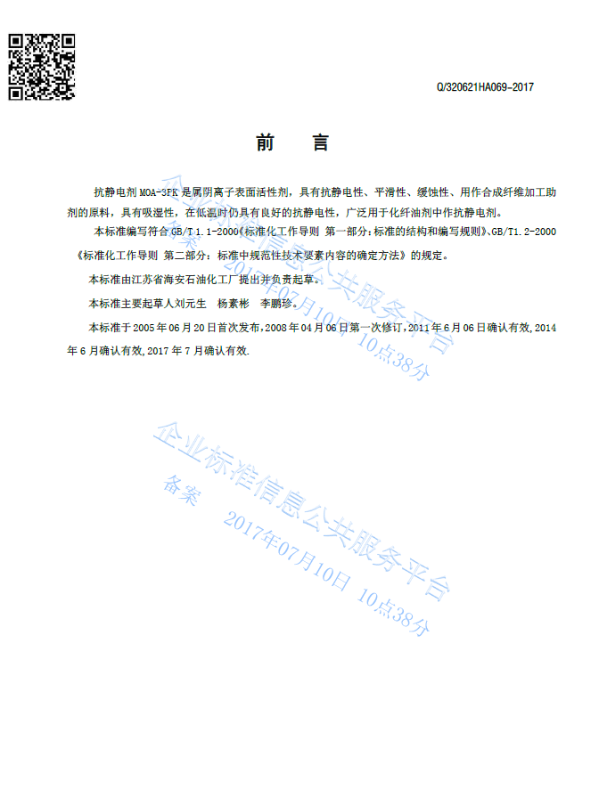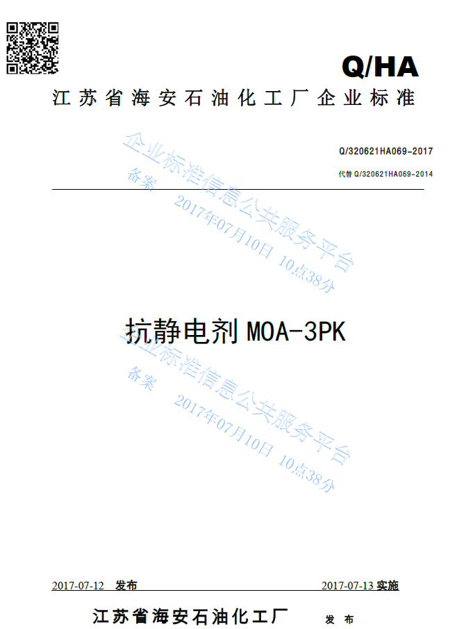 Q/320621HA069-2017 抗静电剂MOA-3PK产品标准