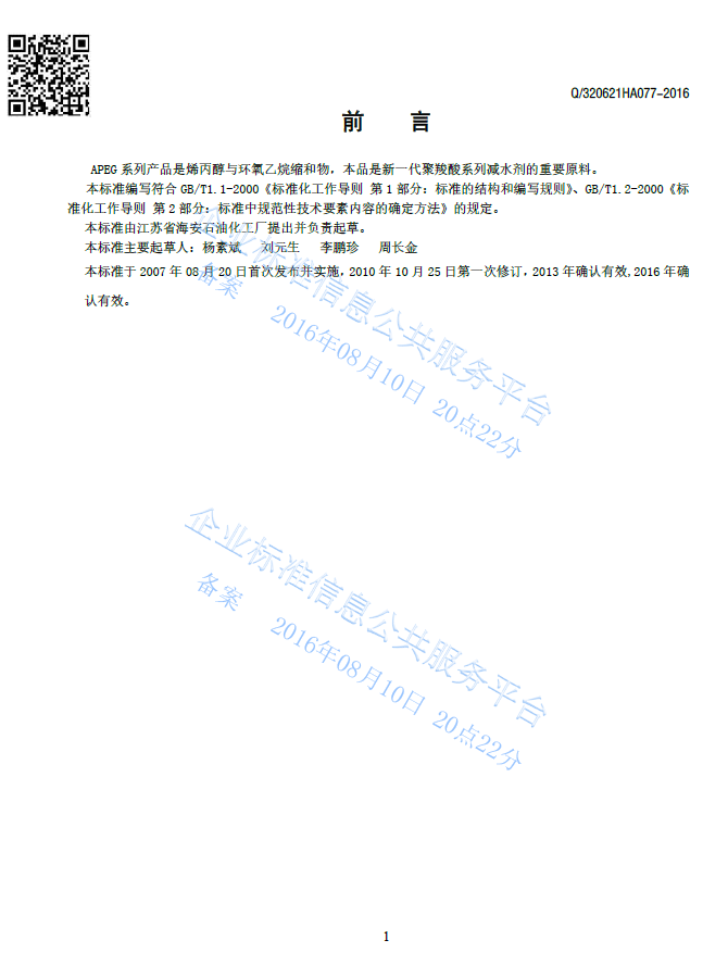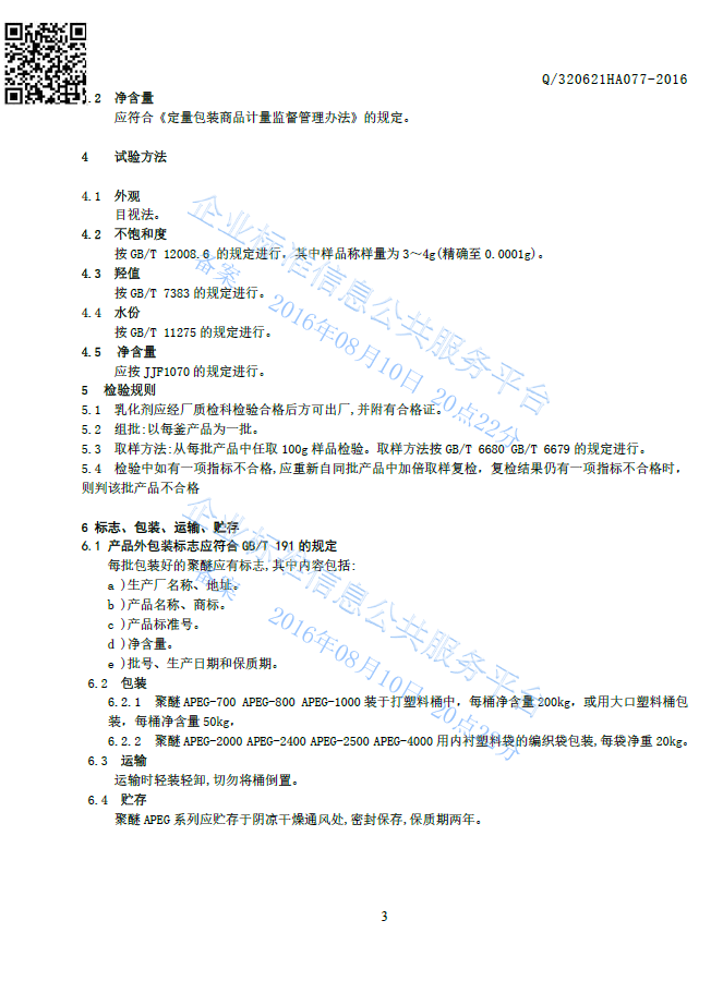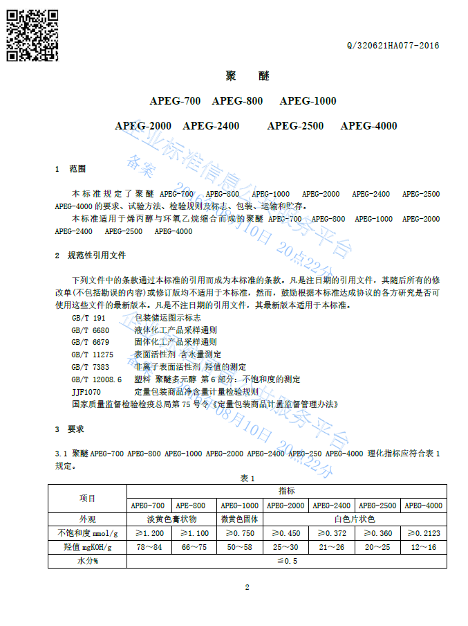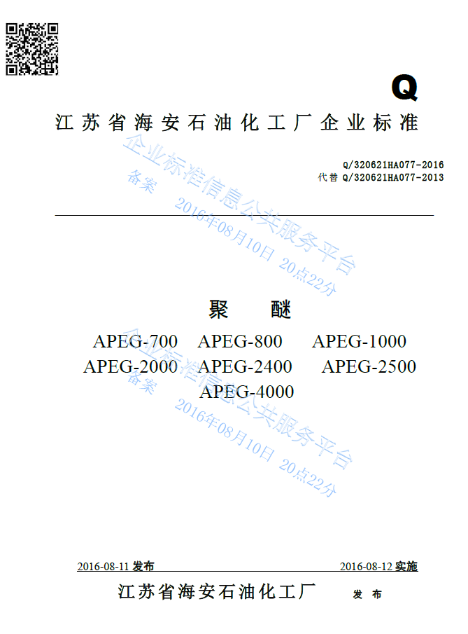 Q/320621HA077-2016 聚醚APEG-700 APEG-800 APEG-1000 APEG-2000 APEG-2400 APEG-2500 APEG-4000产品标准