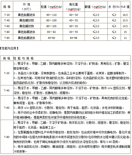 【规 格】吐温T-20、T-40、T-60、T-80、T-85